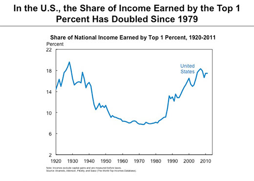 These developments have contributed to some of the momentous changes we have seen in the U.S. economy. This chart shows the share of total income going to the top 1% of families starting in 1920.