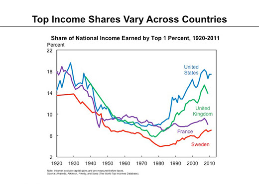 Inequality has followed a broadly similar trend in the U.K., France and Sweden, for example. But notice that the level of inequality varies considerably across these countries, and the rise in the share going to the top 1% varies considerably as well. In Sweden, for example, the share of income brought home by the top 1% rose just 3 percentage points, from 4% in 1980 to 7% in 2011, while in the U.S. it doubled from 10% to 20%.