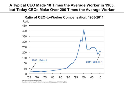 The pay of top executives relative to their workers has soared since the 1980s. In 1965 the average CEO earned about 18 times as much as the average worker; now the average CEO earns over 200 times as much.