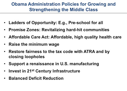 I’ll conclude by explaining why the President’s agenda makes so much sense for our economy. This slide summarizes key elements of the President’s proposals to rebuild the middle class.